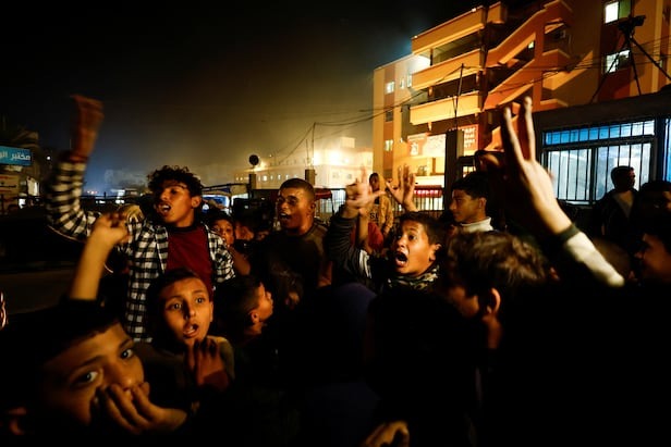 15일 팔레스타인 가자지구 남부 칸유니스에서 주민들이 이스라엘과 하마스 간 휴전 협정 타결 소식에 환호하고있다