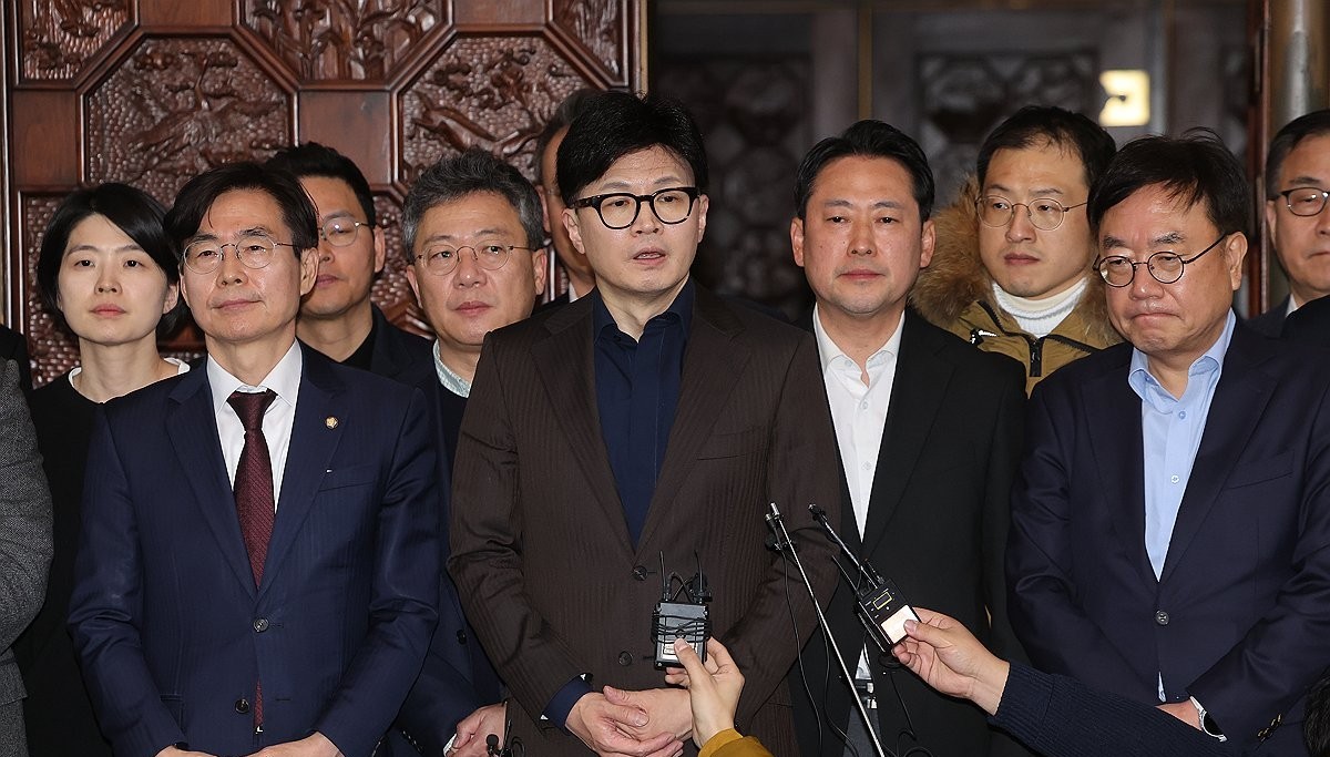 국민의힘 한동훈 대표가 4일 새벽 서울 여의도 국회에서 윤석열 대통령의 계엄 해제 추가 담화 발표에 대한 입장을 말하고 있다