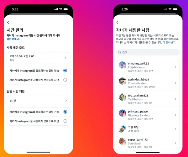 부모는 ‘감독 모드’를 통해 자녀의 인스타그램 사용 시간을 제한할 수 있고, 16세 미만은 부모 허락 없이 설정 변경이 불가능합니다. 이는 청소년들의 SNS 중독 방지 및 온라인 안전 확보를 위한 장치입니다.