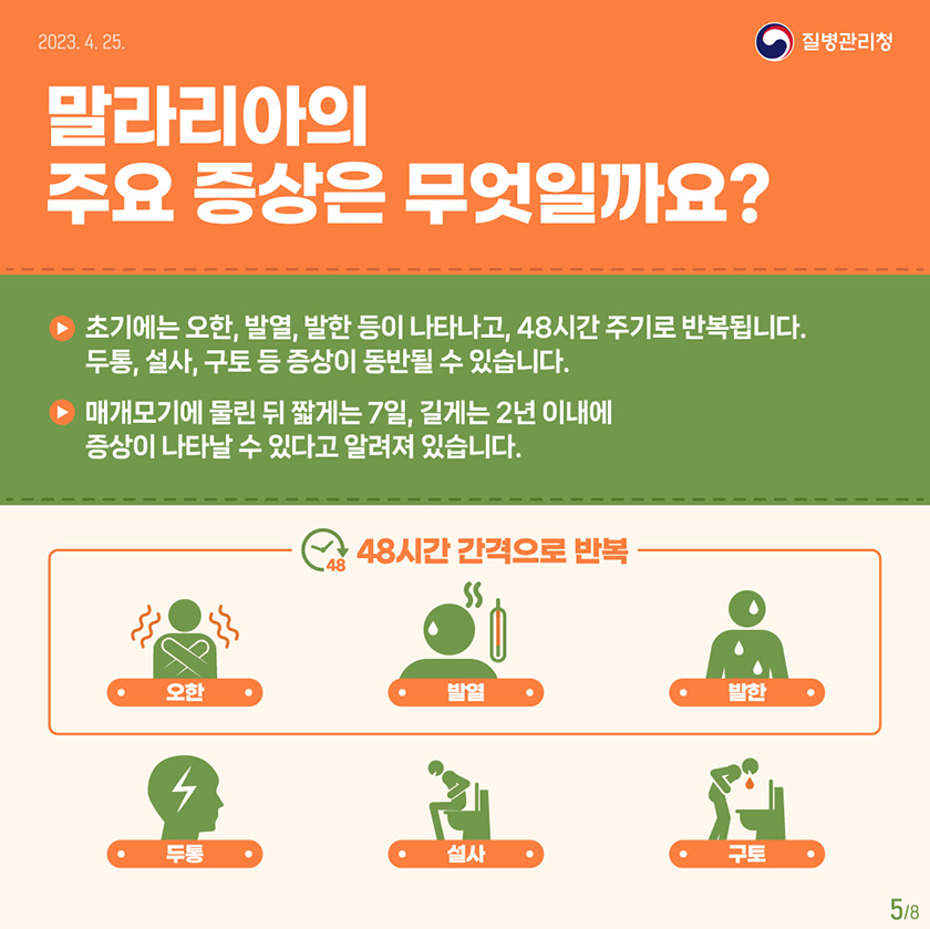 말라리아는 모기에 물려 감염되며, 증상은 국내에서는 주로 '삼일열 말라리아'가 발생합니다. 감염 후 7일에서 2년 이내에 오한, 발열, 발한 증상이 48시간마다 반복되며, 열이 39도 이상으로 오르고 두통과 구토가 동반될 수 있습니다.