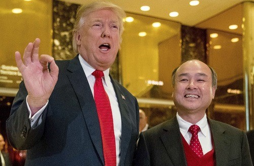 16일 미국 플로리다 마러라고에서 열린 기자회견에 앞서 손정의 일본 소프트뱅크 회장이 도널드 트럼프 당선인 앞에서 미국에 1000억 달러를 투자하겠다고 밝혔다. 트럼프 당선인은 "2000억 달러를 해줄 수 있느냐"고 즉석에서 물었고 손 회장은 "노력하겠다"고 했다.