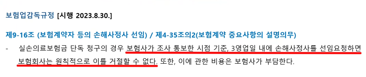 실손 보험 단독 청구일 때 3 영업일 내에 손해 사정사를 선임 요청하면 보험 회사가 원칙적으로 거절할 수 없다고 명시되어있습니다. 이때 비용은 보험 회사가 부담하게 법으로 명시되어 있고요.