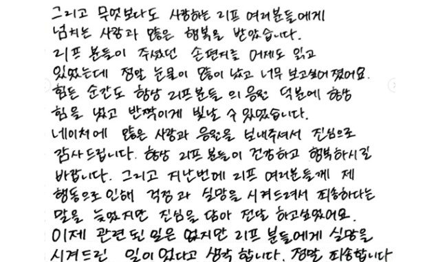 하루는 자필 편지를 통해 팬들에게 사과의 메시지를 전했습니다. 그녀는 힘든 상황 속에서도 목표를 위해 노력하고 있으며, 팬들의 응원에 항상 감사한다고 밝혔습니다. 또한, 아이돌 활동을 마무리하고 새로운 도전을 준비 중이라고 전했습니다.