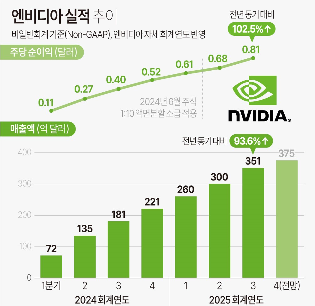 엔비디아는 4분기 매출 전망치를 375억 달러로 제시했으며 이는 시장 예상치(370억 달러)를 웃도는 수준입니다.