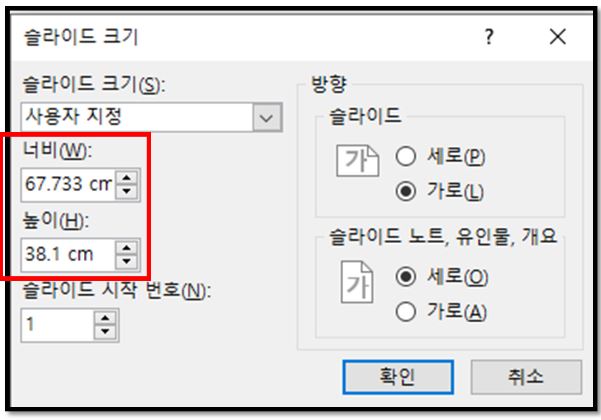 오른쪽 화면에서 와이드 스크린을 선택하고 사용자 지정 슬라이드 크키를 선택합니다.