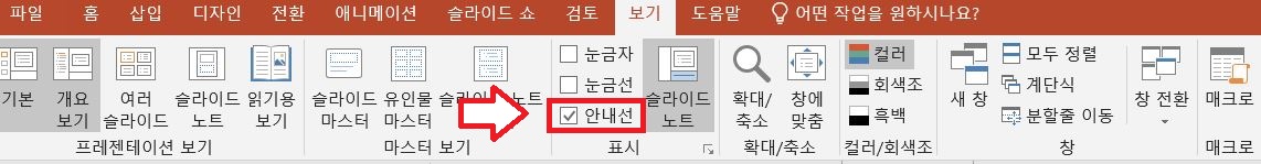 보기탭에서 안내선을 체크하시면 안내선이 나오게 됩니다