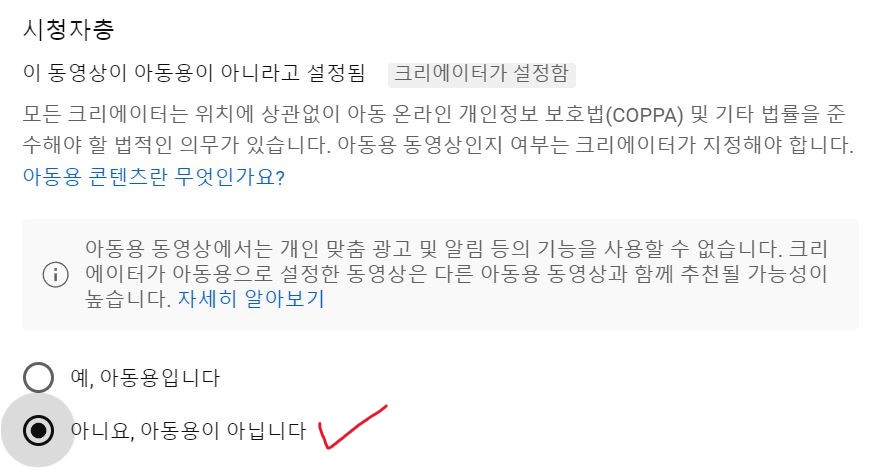 영상 업로드 할 때마다 체크하기 불편하시면 채널 설정 수정을 한번 해놓으시면 고정적으로 아동용이 아닙니다라고