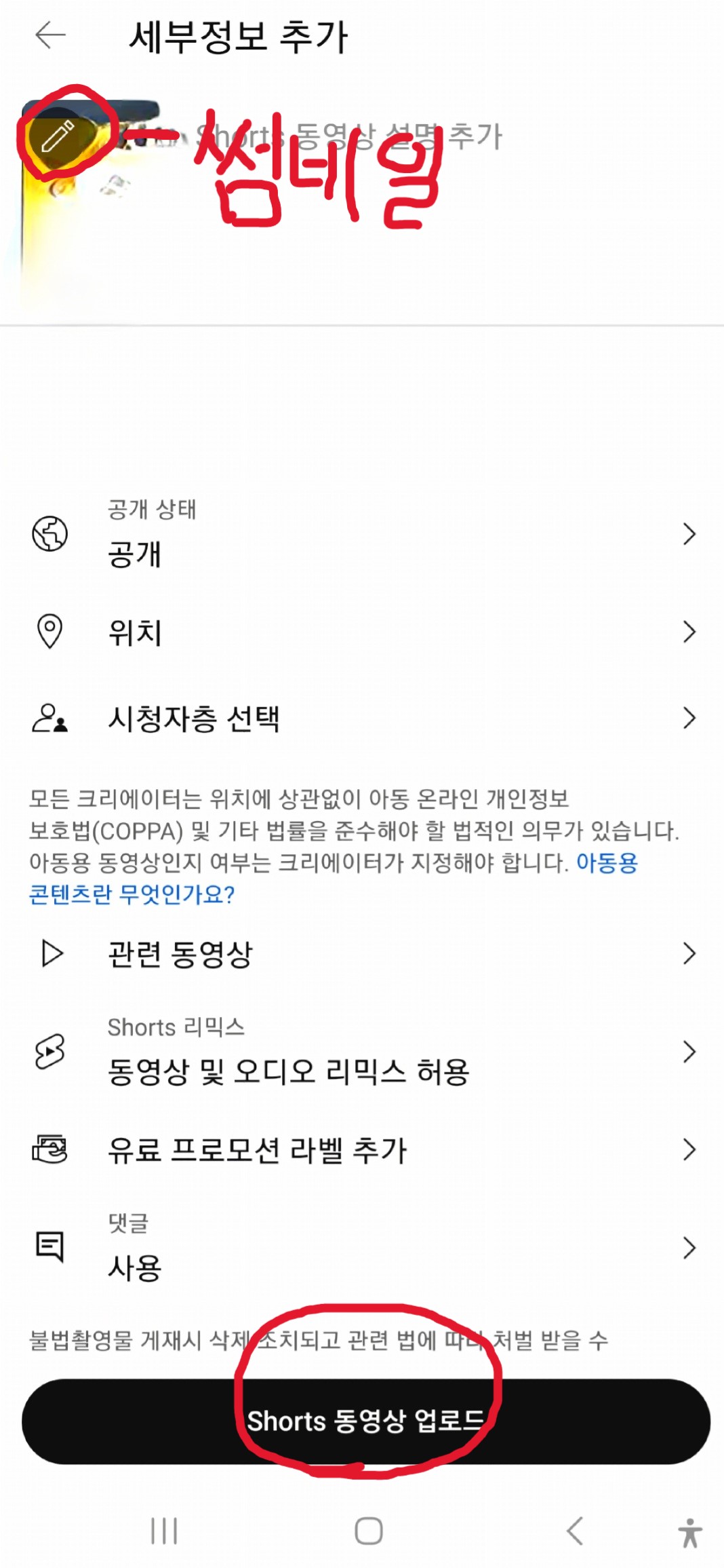 물론 유튜브 쇼츠 특성상 썸네일을 보고 조회를 하시는 분은 없으시지만 썸네일은 모바일만 가능하세요.