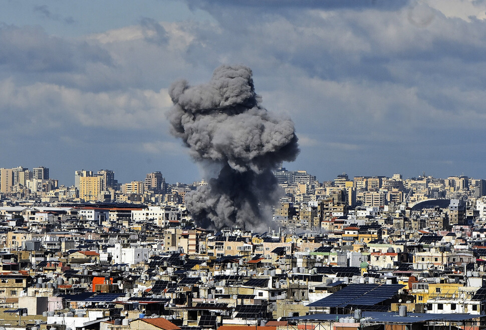 26일(현지시각) 이스라엘군이 레바논 베이루트의 다히예 지역에 공습을 가한 후 건물에서 연기가 피어오르고 있다.