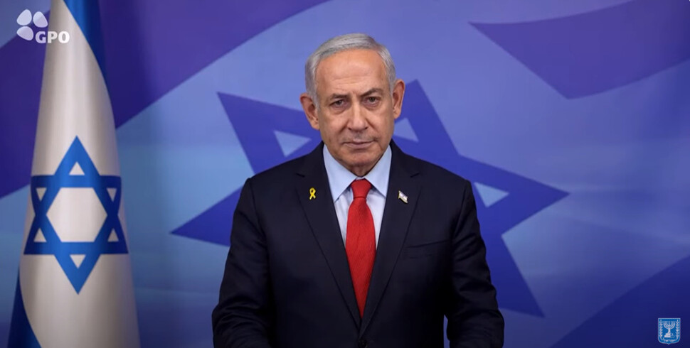 26일(현지시각) 베냐민 네타냐후 총리가 레바논과의 휴전 이유 등을 설명하고 있다. 이스라엘 총리실 유튜브 갈무리.