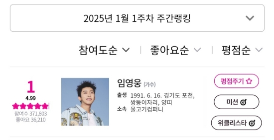 가요계의 초강력 스타 임영웅이 또 한 번 기록을 세웠습니다. 최근 1월 1주 차 아이돌차트 평점랭킹에서 임영웅은 37만1803표를 얻으며 198주 연속 1위에 올랐다고 합니다. 그의 압도적인 팬덤이 만들어낸 이 위업은 계속되는 그의 인기를 다시 한 번 증명하는 순간입니다.