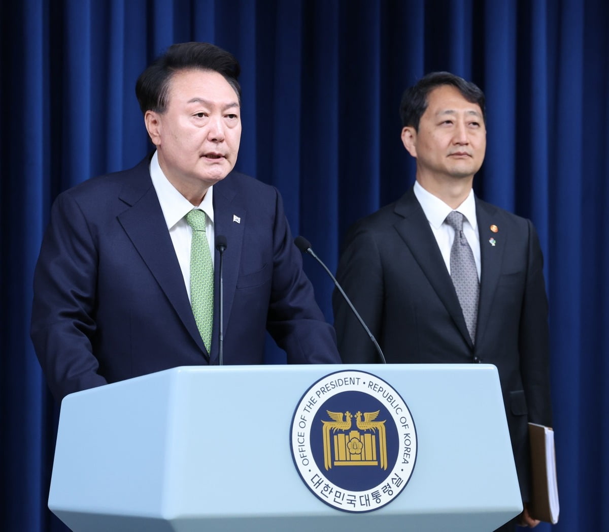 윤석열 대통령이 3일 용산 대통령실 청사에서 첫 국정브리핑을 하고 있다.